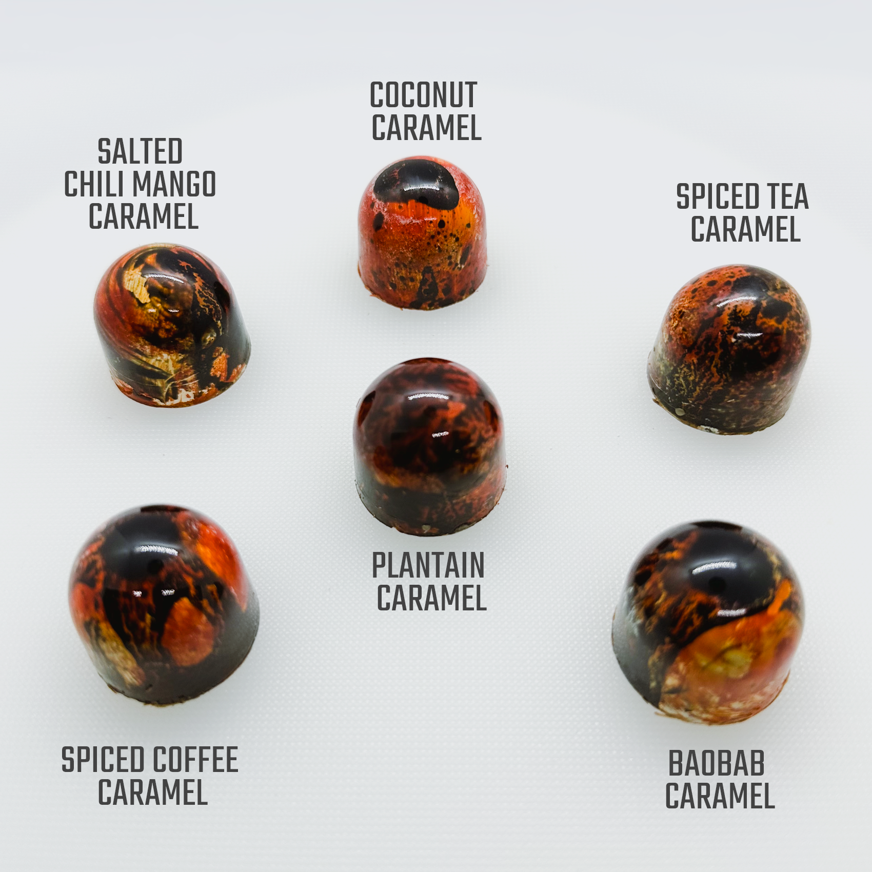 Six signature bonbons inspired by African flavours and seasonal ingredients, including: